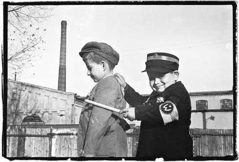 The two children appear to have been playing a game when Grossman captured the photo as they are standing, one behind the other. The child on the left is wearing clothes that children during the second world war would be found to typically wear. However, the child to the right, stood behind, is dressed in clothes that would be found on a police officer with a striped cap upon his head. He also wears an armband wrapped around his left arm, which is also holding a baton, placing it on the other child arm, with his right hand placed on the shoulder in front of him. The child at the front seems to be held there, as if in custody, whilst the child in uniform seems to be the authoritative figure, with a big smile on his face, enjoying the power it has given him.